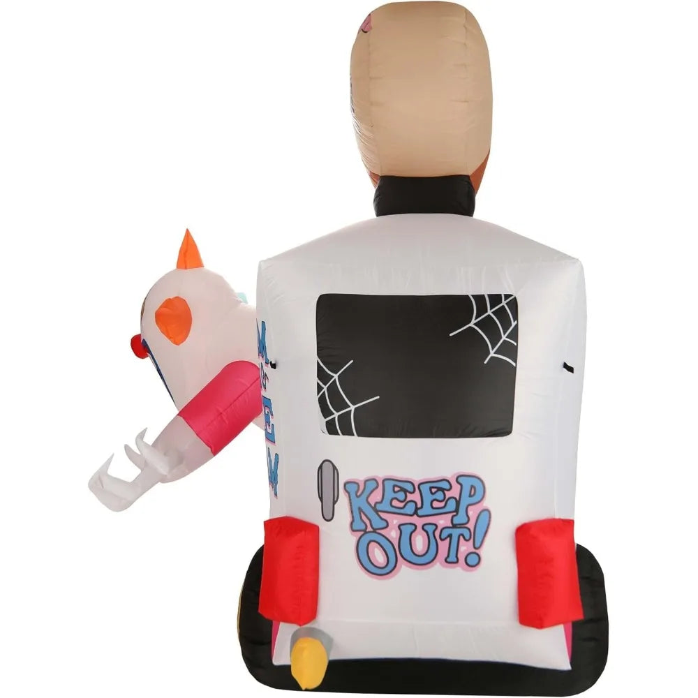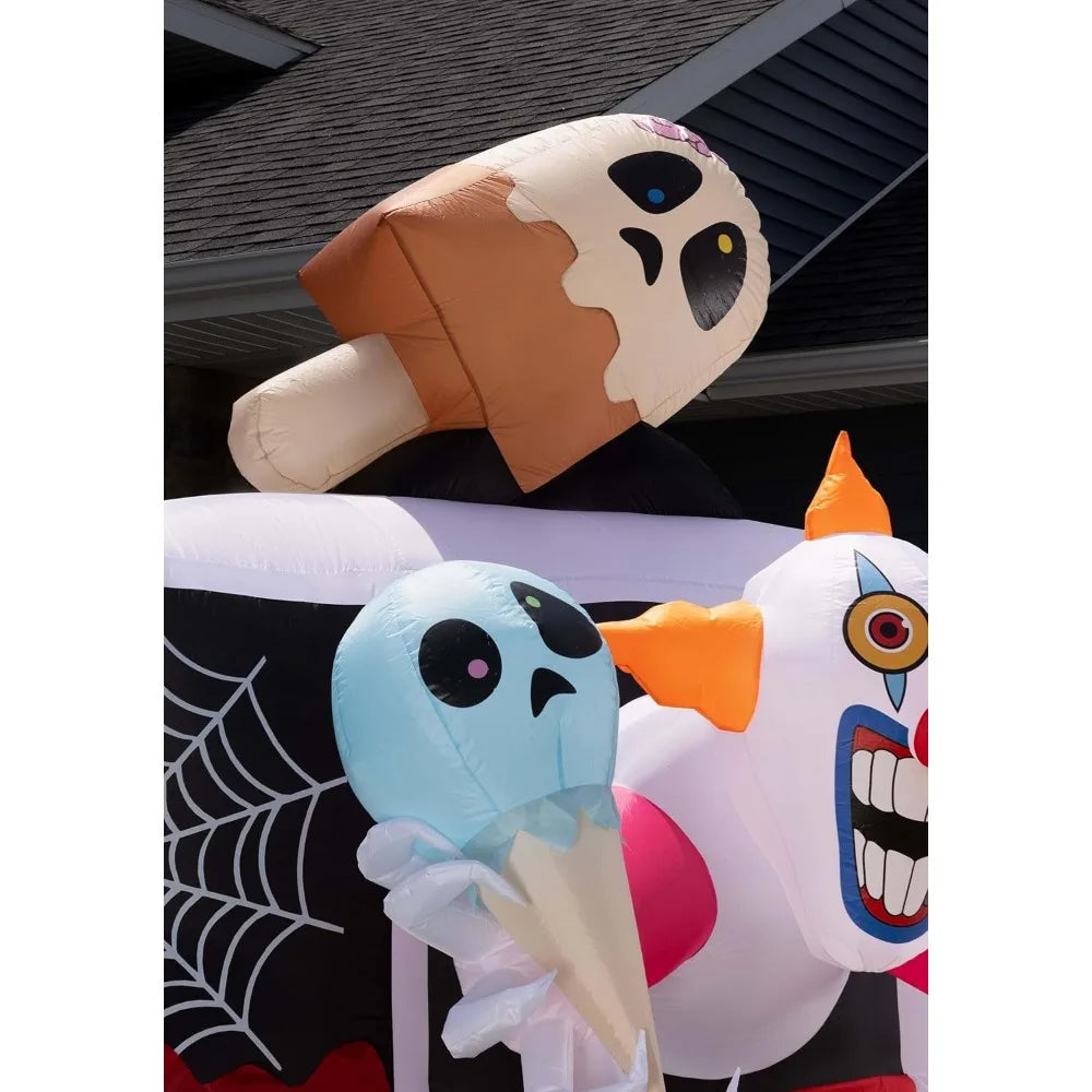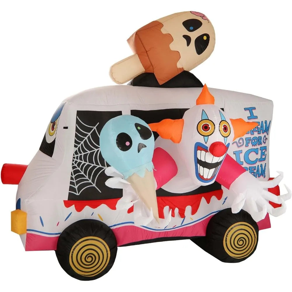 - When fully inflated, this killer clown decoration comes with tons of amazing details! It recreates the look of an ice cream truck, with a scary clown popping out of the side. It even has an ice cream treat shaped like a skull on the very top. "I Scream for Ice Cream" is printed on the side.