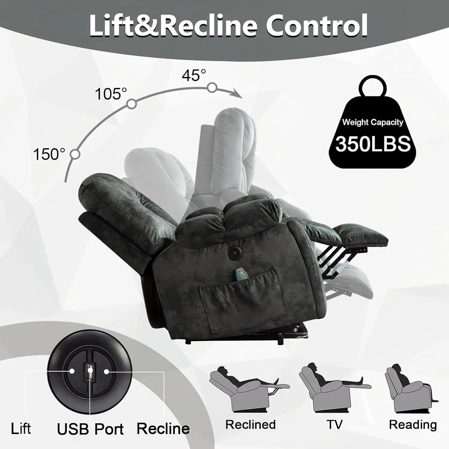 USB charging port will allow you charging your Low Power devices during you sitting or reclining.